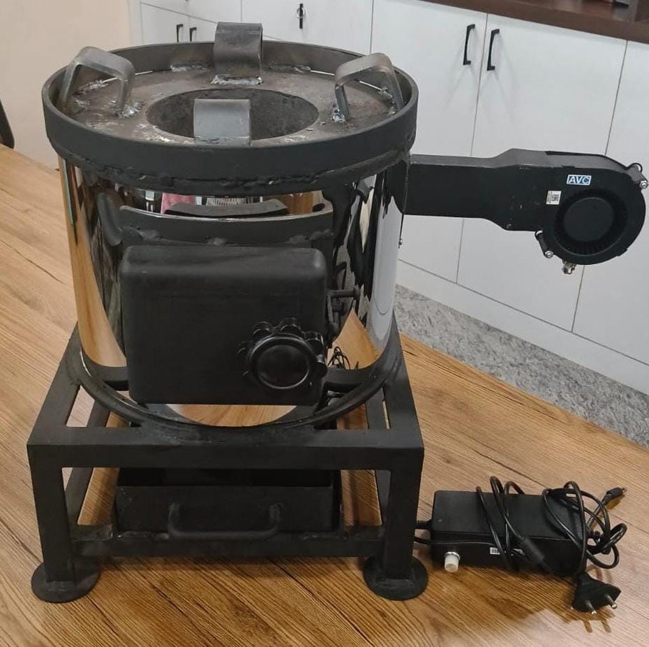 *Delivery charges extra* 4KG Turbo Stove - With blower, adaptor with speed controller ,ash tray & Wood feeding door Provided with ceramic insulation Cooking capacity: 4 kg Dimension: L X B X H -21” x 15 ”x 21” Inner Dia - 6” Outer Dia - 12” Weight - 40 kg Inner Chamber -10 mm Cast Iron Outer - Stainless Steel Packing - EPF Sheet Warranty - 6 months for blower and adaptor only